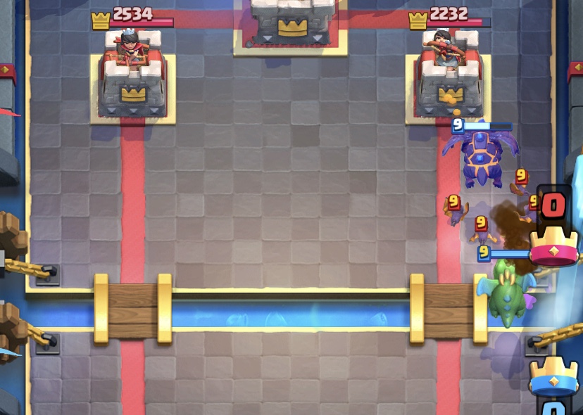 陸の高火力ユニットであるミニペッカ、その盾であるメガナイトを突破してしまえばかなり大きなダメージ、さらにはタワーを折り切ることも狙えます。