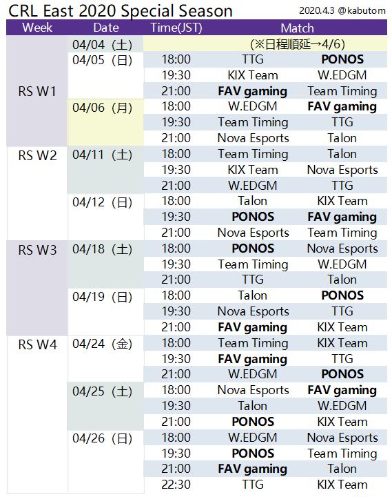 『CRL East 2020 SS』は2020年4月4日(土)に開幕し、5月23日(土)までの毎週土曜日、日曜日に公式戦が実施されます。