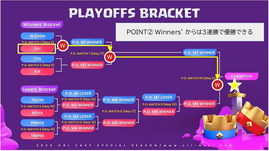 日本チームFAV gamingをふくむレギュラーシーズン上位の4チームはWinners’(勝者)ブラケットのスタートになります。優勝のための条件は、3連勝することです。