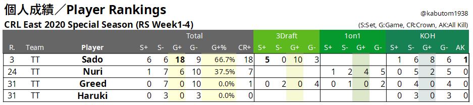 韓国のTimingは、2勝5敗のレギュラーシーズン7位と苦しみました。Sado選手の奮闘でSet2(TPD)は好結果だったのですが、Set1(KOH)とSet3(1v1)を1度ずつしか取れませんでした。