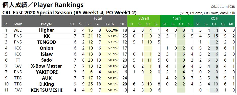 ゲーム勝率1位は66.7%でHigher選手(W.EDGM)。彼はTPDのセットで100%(2/2)、1on1のセットで100%(4/4)とシーズンを通じて”無敵の快進撃”を続けてきました。