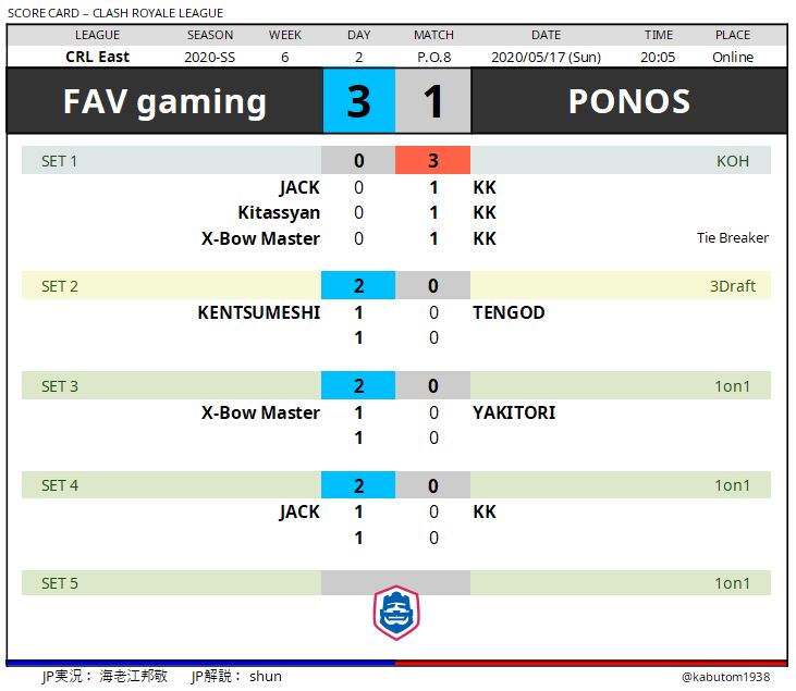 スコアは見ての通りです。まとめるなら、”5連勝PONOSの好調を支えてきた天GOD選手・焼き鳥選手・KK選手の”三連星”を正面からねじ伏せたFAVの力強さ!”ということになるのですが・・・。
