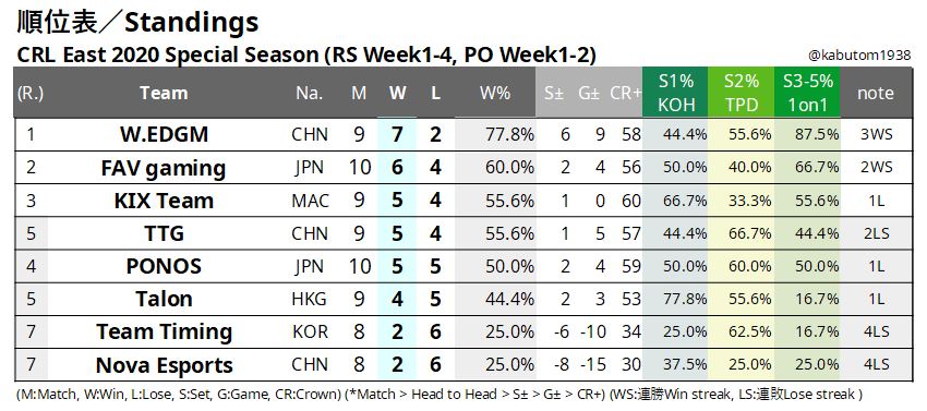 CRL East 2020 SS レギュラーシーズンとプレイオフを通算した順位表です。順位自体ではなく、各チームの”性格”をつかめるようにと用意しました。