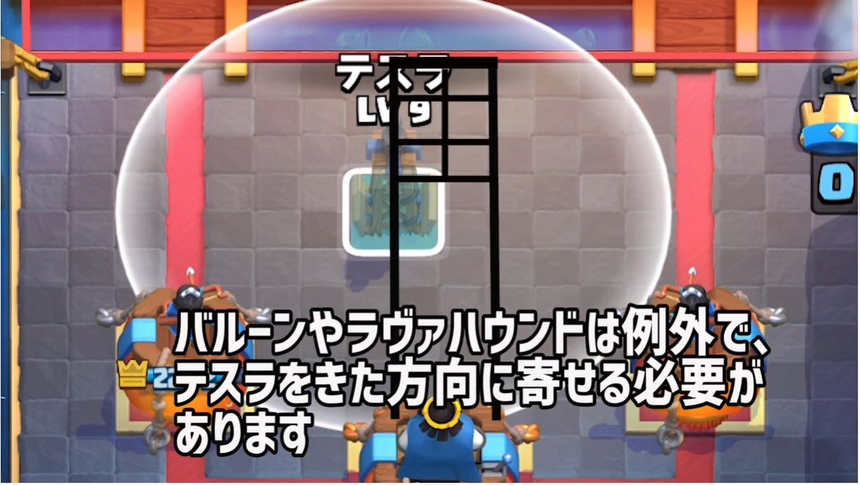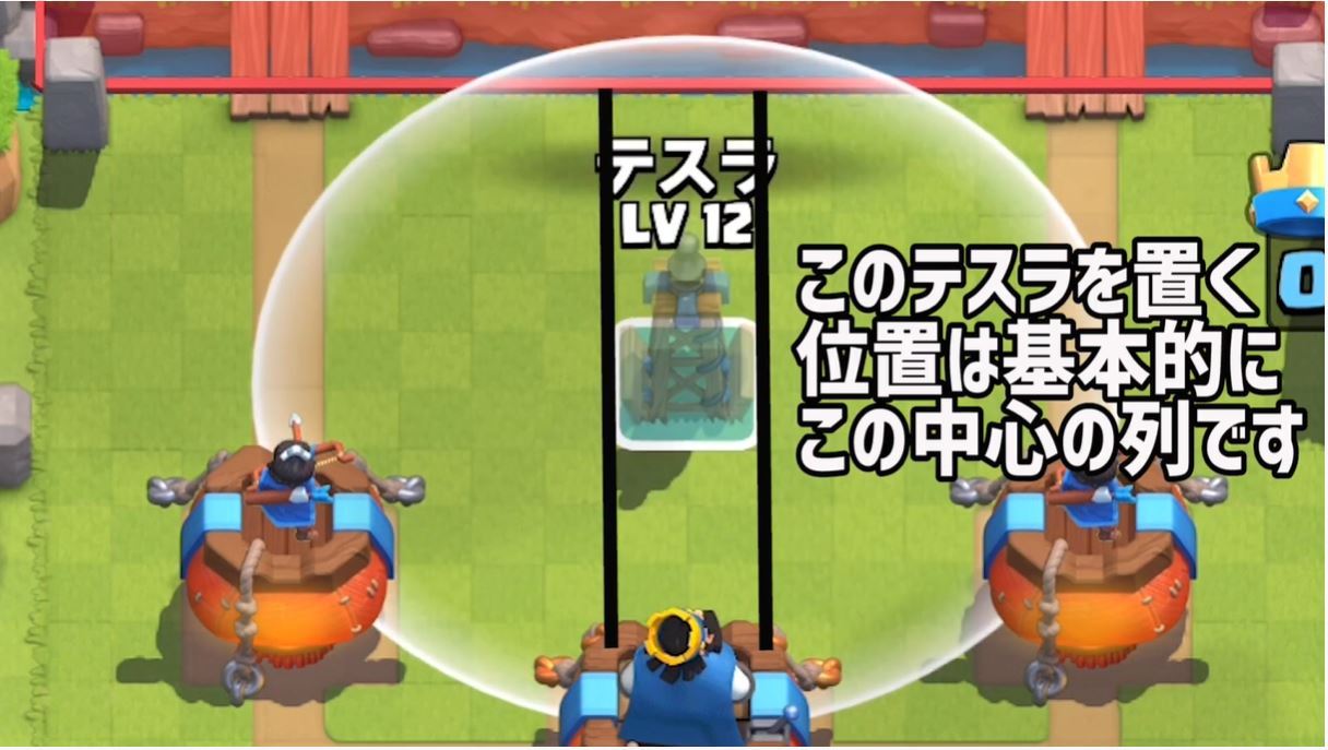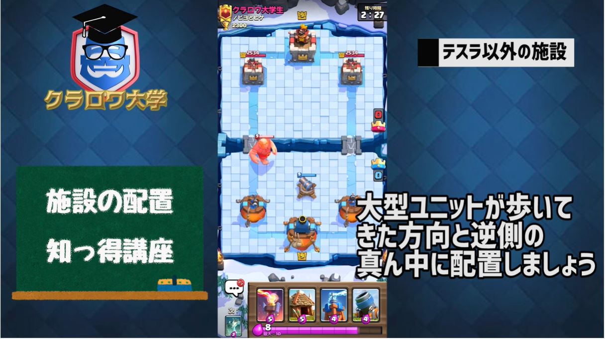 ここに置くことで自陣内を最大限歩かせることができ、プリンセスタワーの攻撃をフル活用して相手ユニットのHPを削っていくことができます。