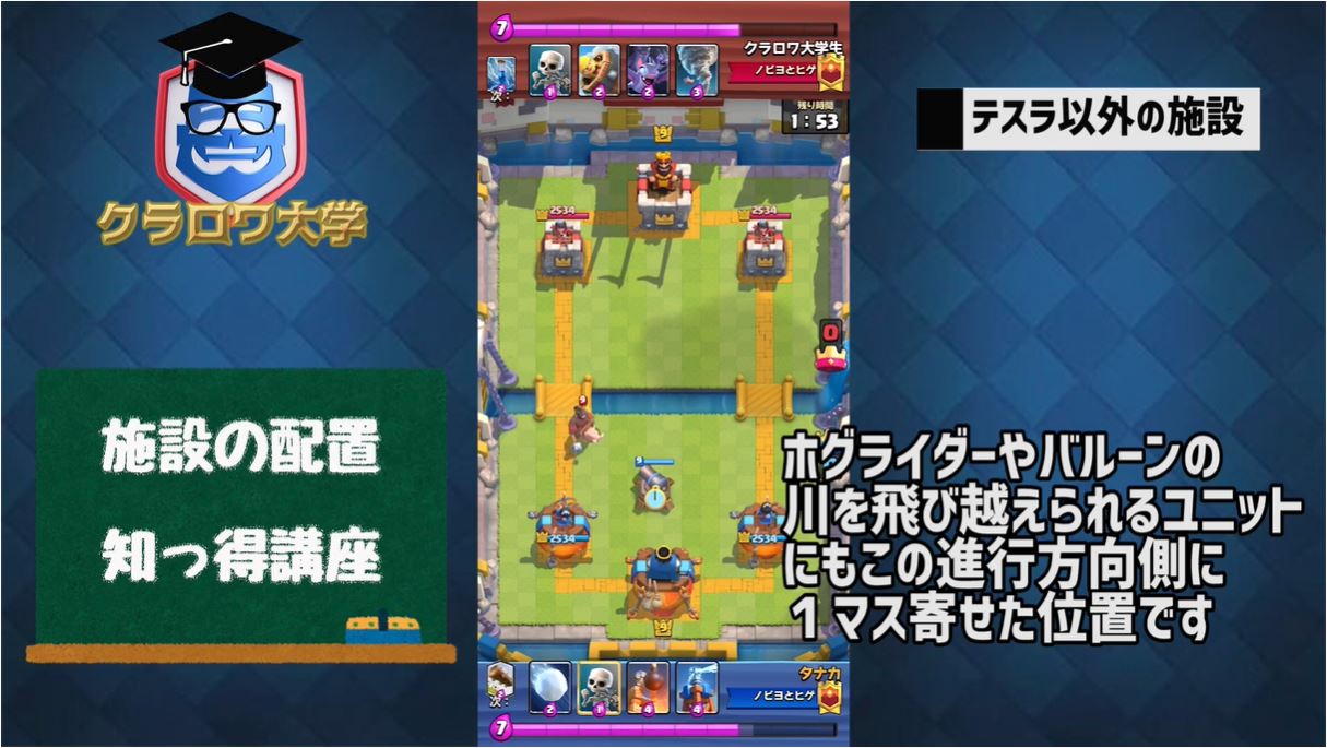 川を飛び越えられるタイプの、攻撃対象が建物のみのユニット(ホグライダーなど)が攻めてきた場合は、川から3マス下の中央位置が正しい置き場所です。