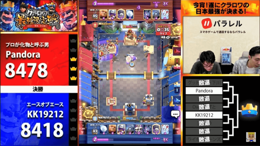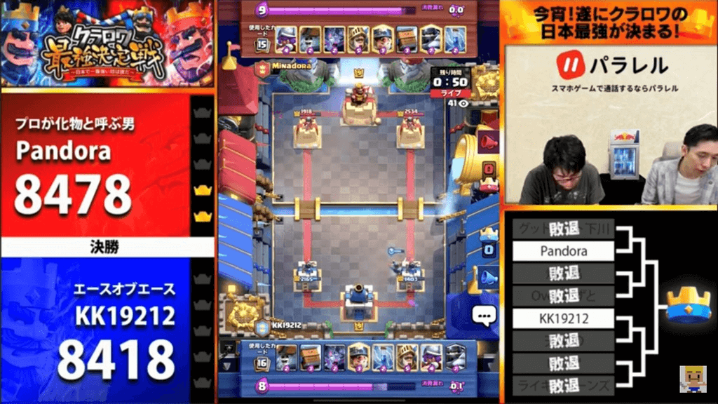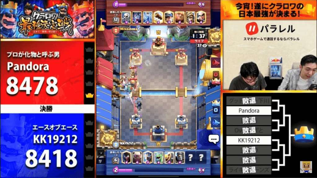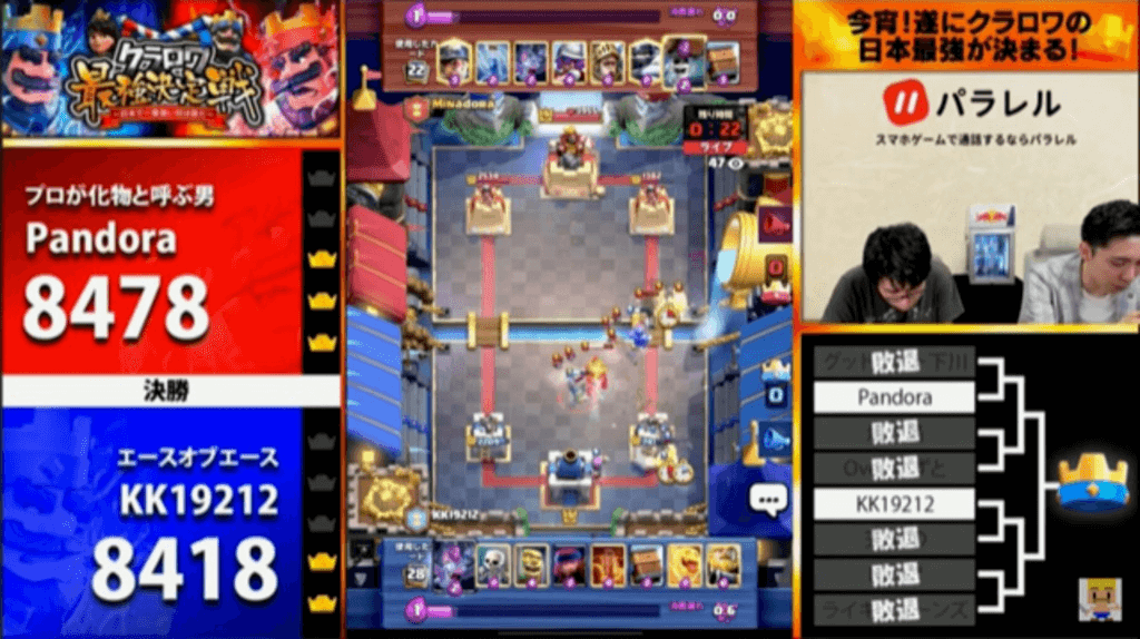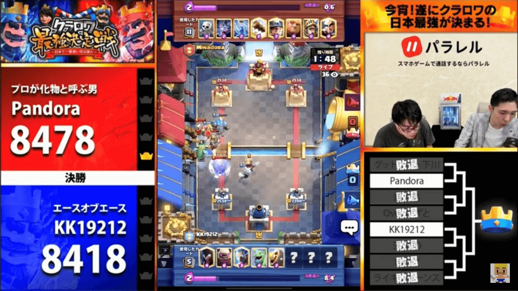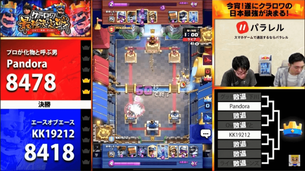 さらにプリンス、ディガーを追加し、キングタワーも大きく削ることに成功。その後も攻めの姿勢を緩めず、2本目のタワーも折り切りPandora選手が勝利。