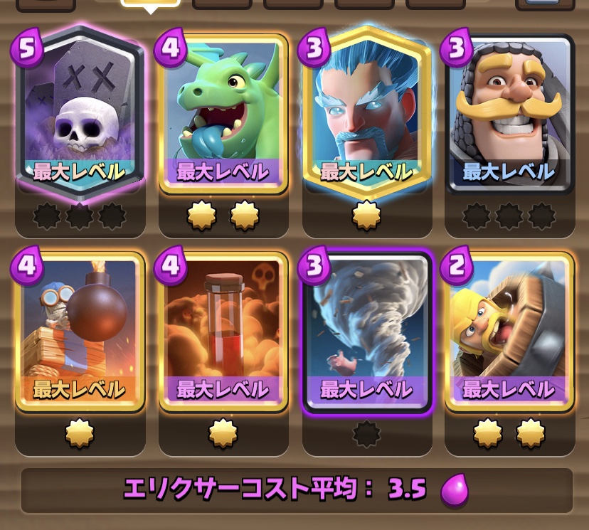 アイスウィザードとトルネードを使った遅延効果、強力な範囲攻撃ユニットであるベビードラゴンとボムタワーを組み合わせ、鉄壁の守りからカウンターを決めていくというコンプセプトのデッキになっています。