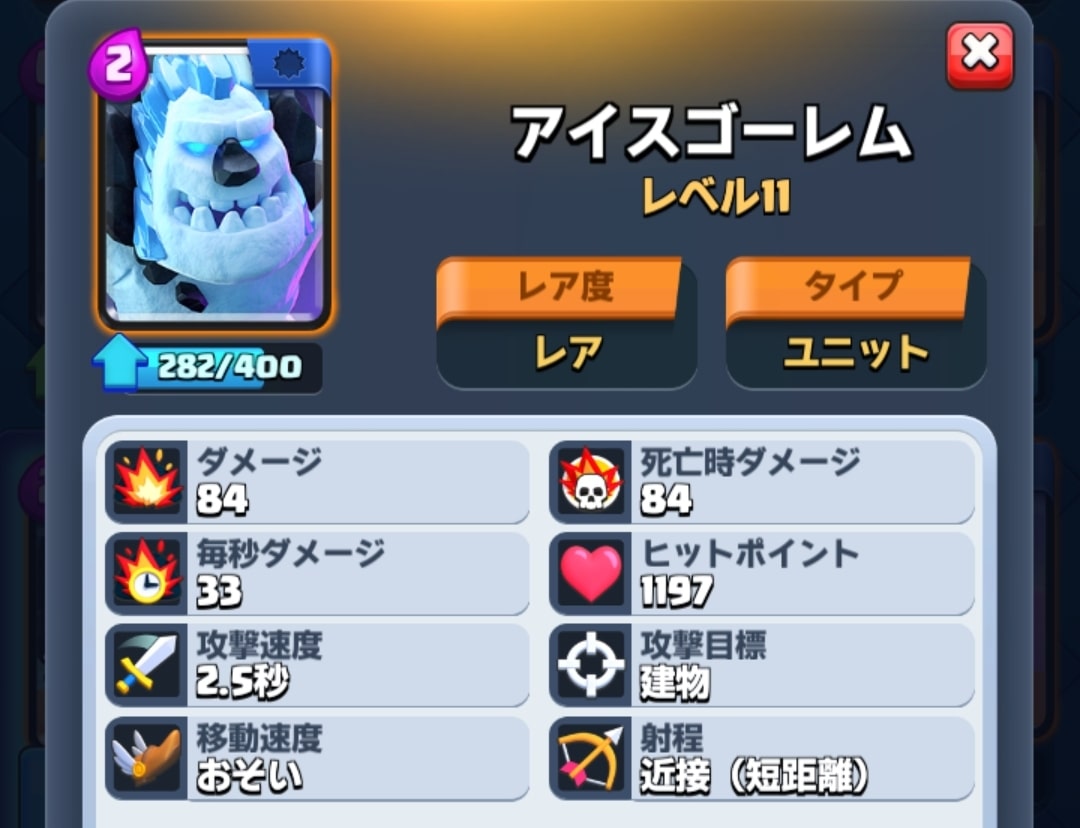 アイスゴーレムは2コストのユニット中1位のHP(ヒットポイント)を誇ります。また、死亡時に遅延効果つきのダメージを付与することが特徴です。
