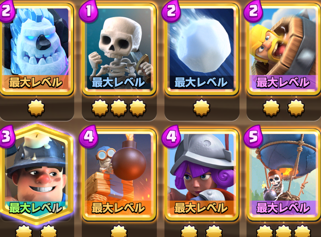 上で紹介した組み合わせの「アイスゴーレム+エアバルーン」で大ダメージを狙うデッキです。
