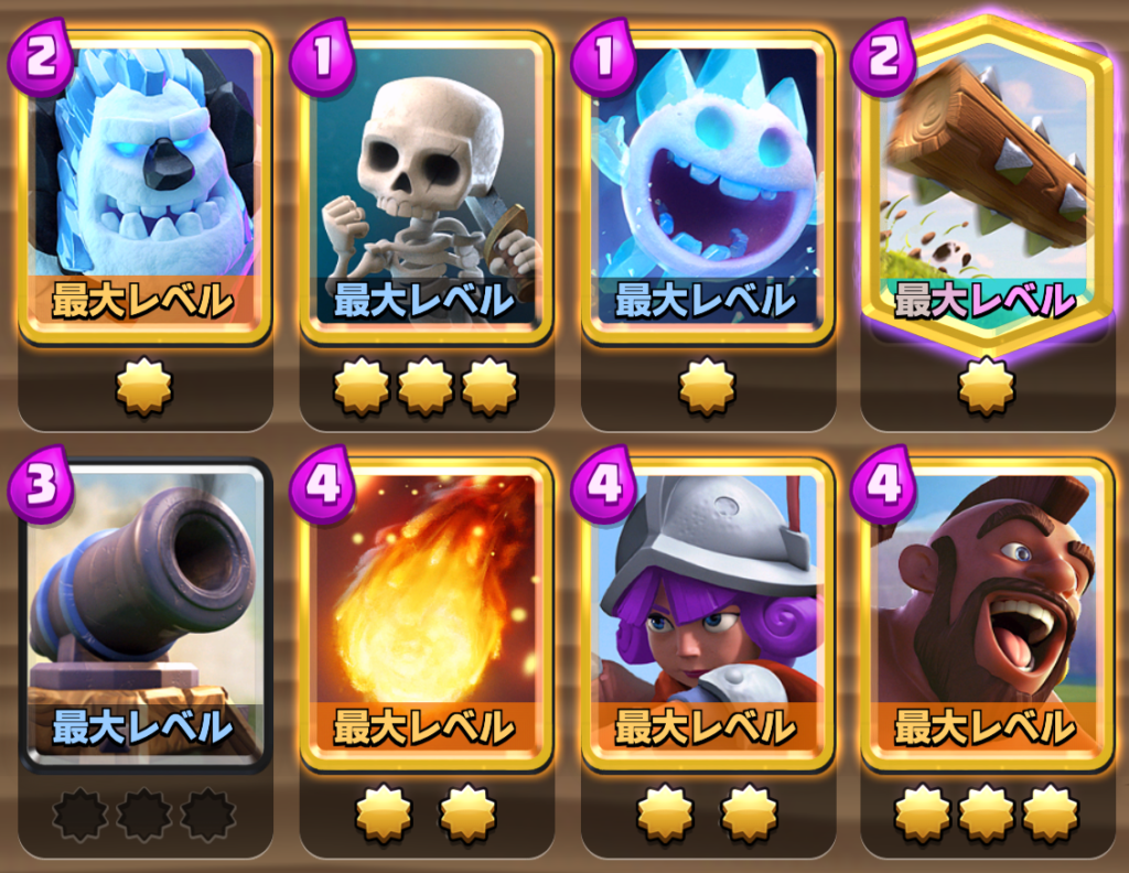 アイスゴーレム+ホグライダー、アイスゴーレム+マスケット銃士等の強力な攻めの形も作りやすい構成になっています。