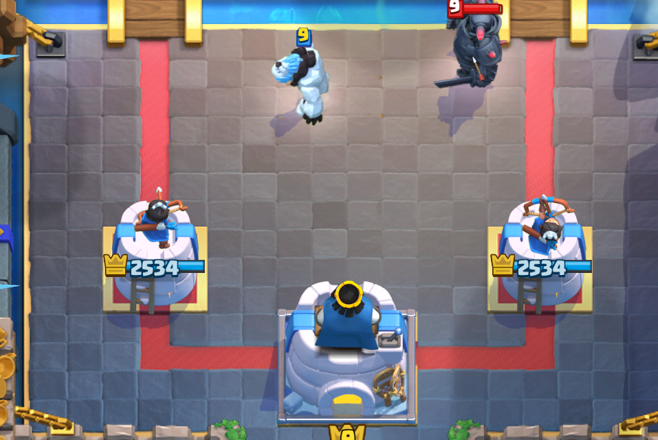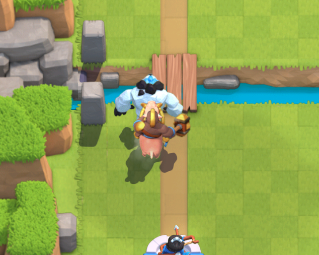 本来であればユニット同士対峙するシーンですが、アイスゴーレムの攻撃目標が建物のため、ペッカを尻目に左上の相手タワーに歩いて行きます。