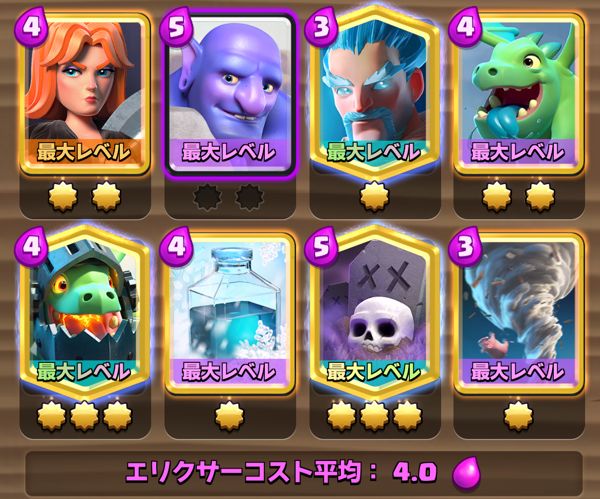 そのため、まとまったユニットでカウンターされても対処しやすいように「バルキリー、ボウラー、アイウィズ、ベビドラ」などの範囲攻撃豊富なデッキになっているのが特徴的です。