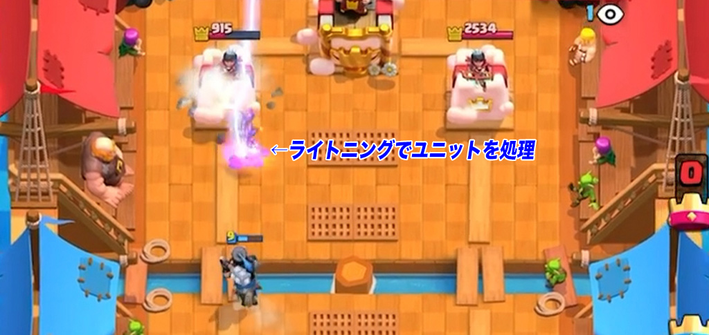 低コストで相手の大型ユニットを処理することができ、キング起動後であれば更に効果的な防衛テクニックとなります。