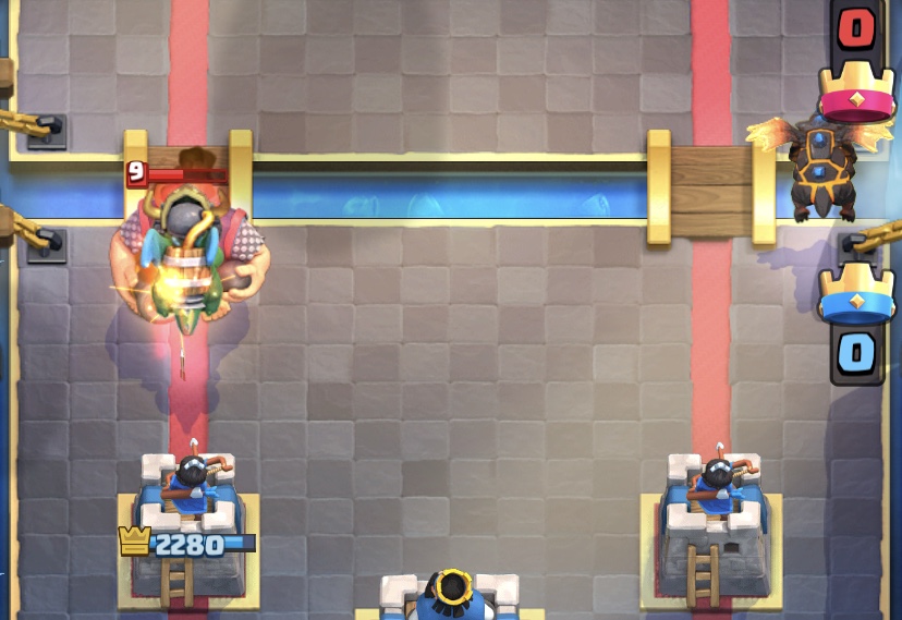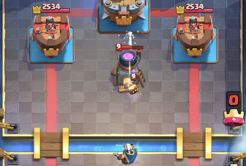相手がロイジャイをキングタワー裏から展開したら、すかさず逆サイドの橋前から一気にカウンターを仕掛けます。
