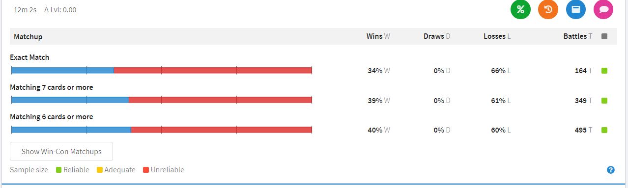 “相性”に関する統計データです。8枚一致・7枚以上一致・6枚以上一致の3通りに分けて、実際の対戦での勝敗結果が表示されます。