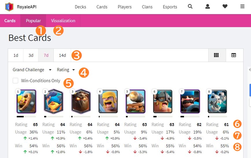 各カードの下に表示されている「Rating(評価)」というのは、使用率と勝率からRoyaleAPIが統計的に導き出した総合評価の数値です。