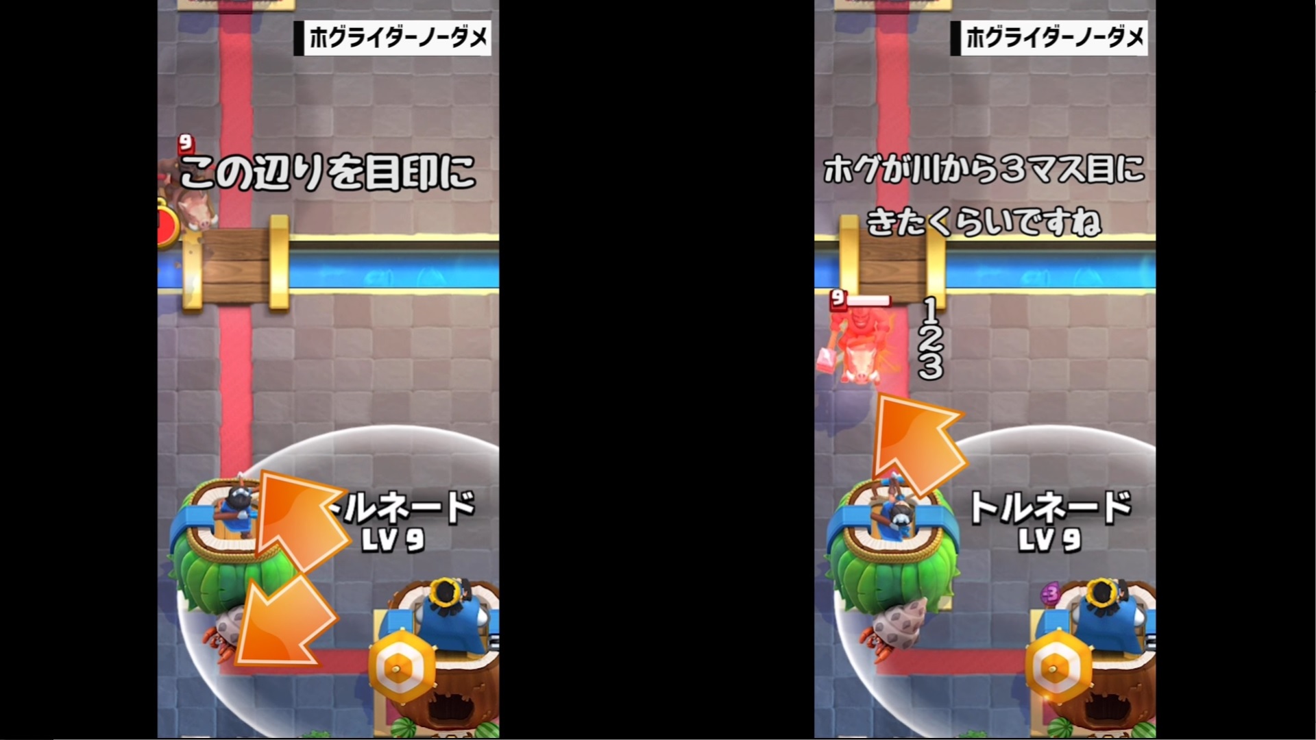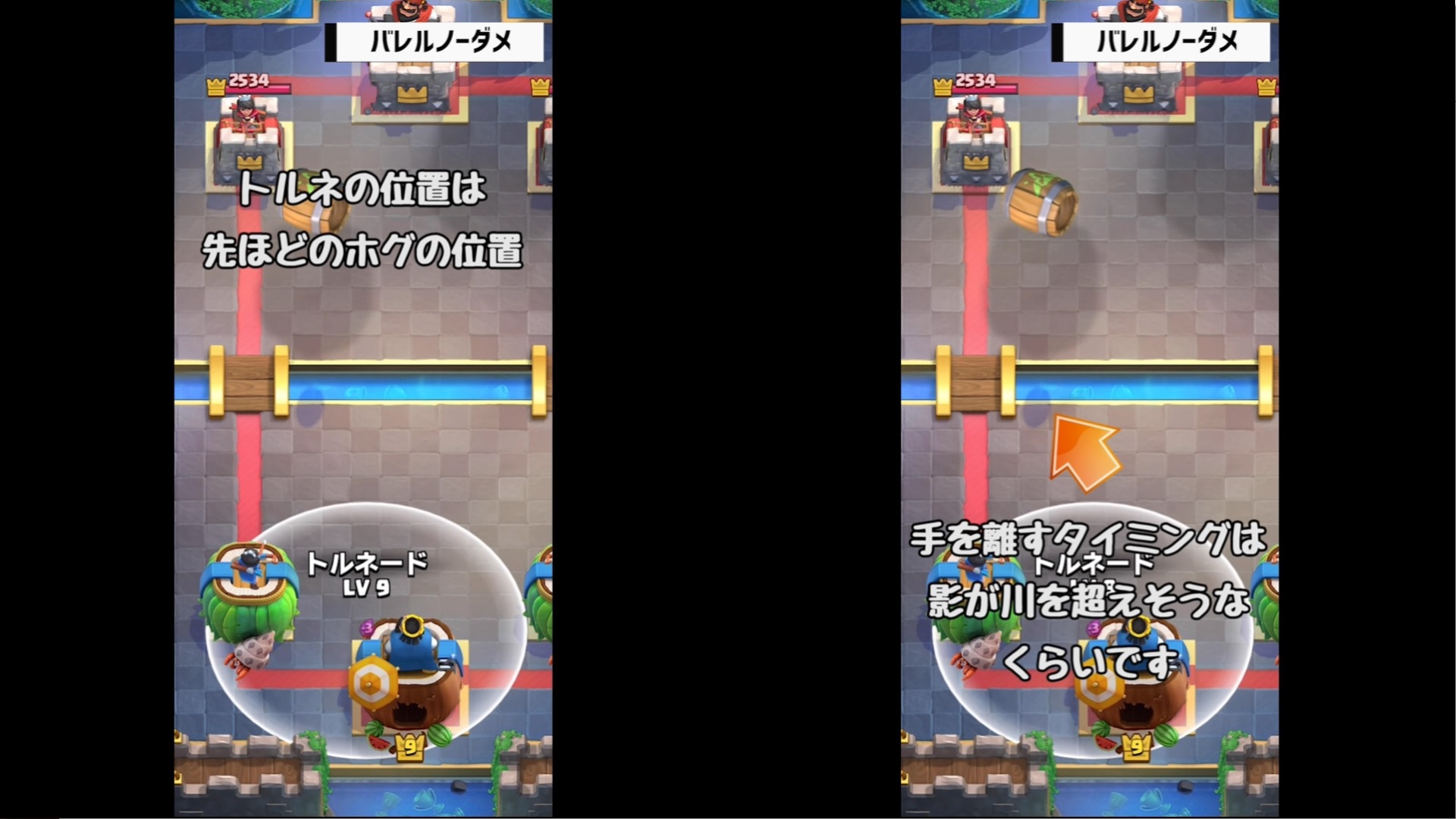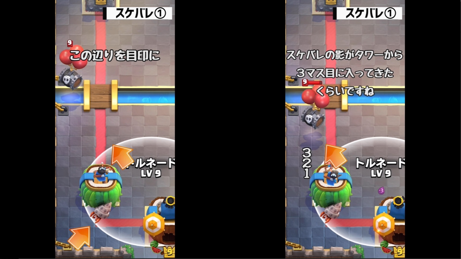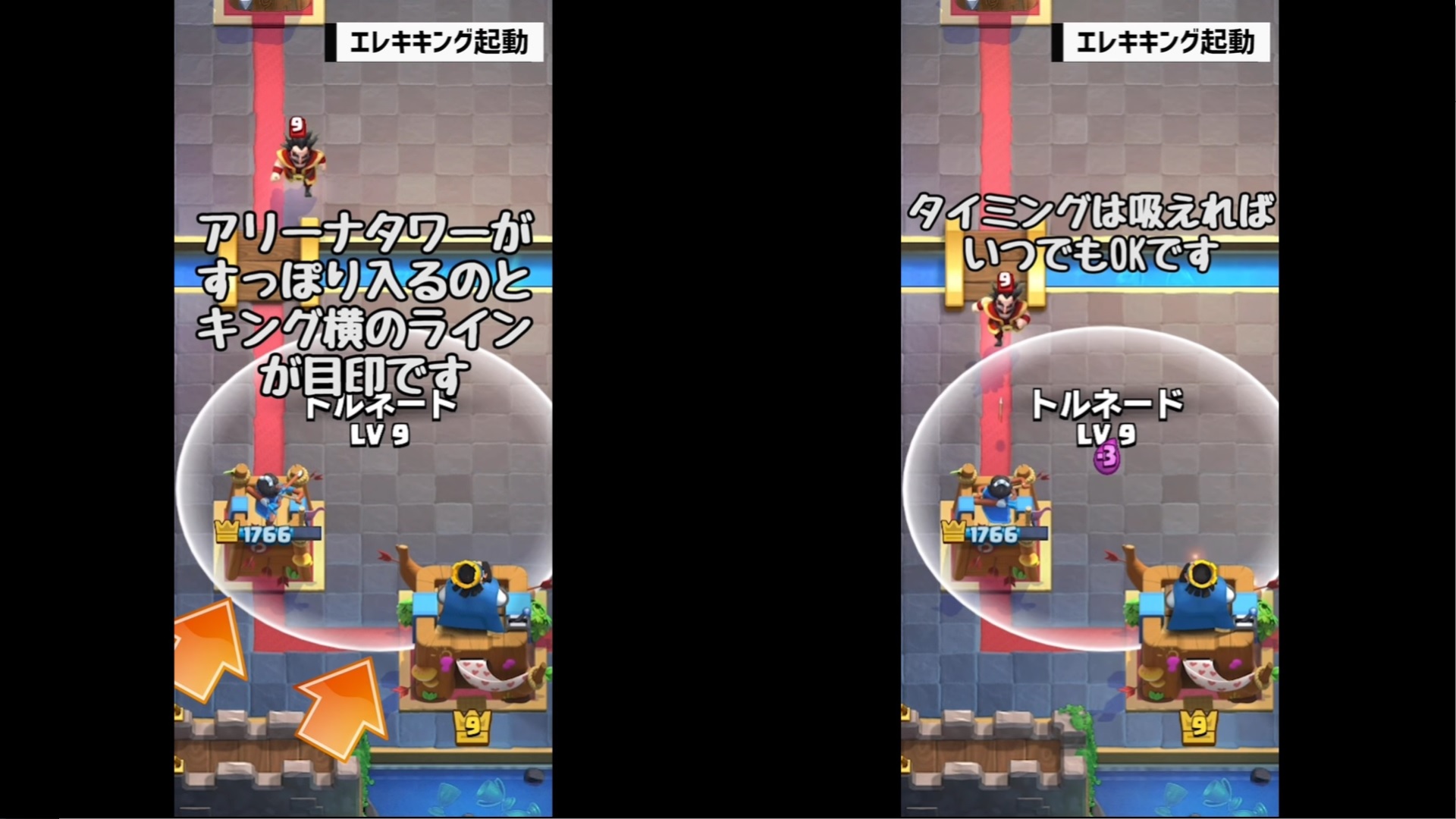 それでは、クラロワ大学さんの動画「【クラロワ】トルネード小技集!キング起動の基本から応用まで!|Tornado ProTips【ClashRoyale】」を教科書にして、トルネードの位置とタイミングを覚えていきましょう。