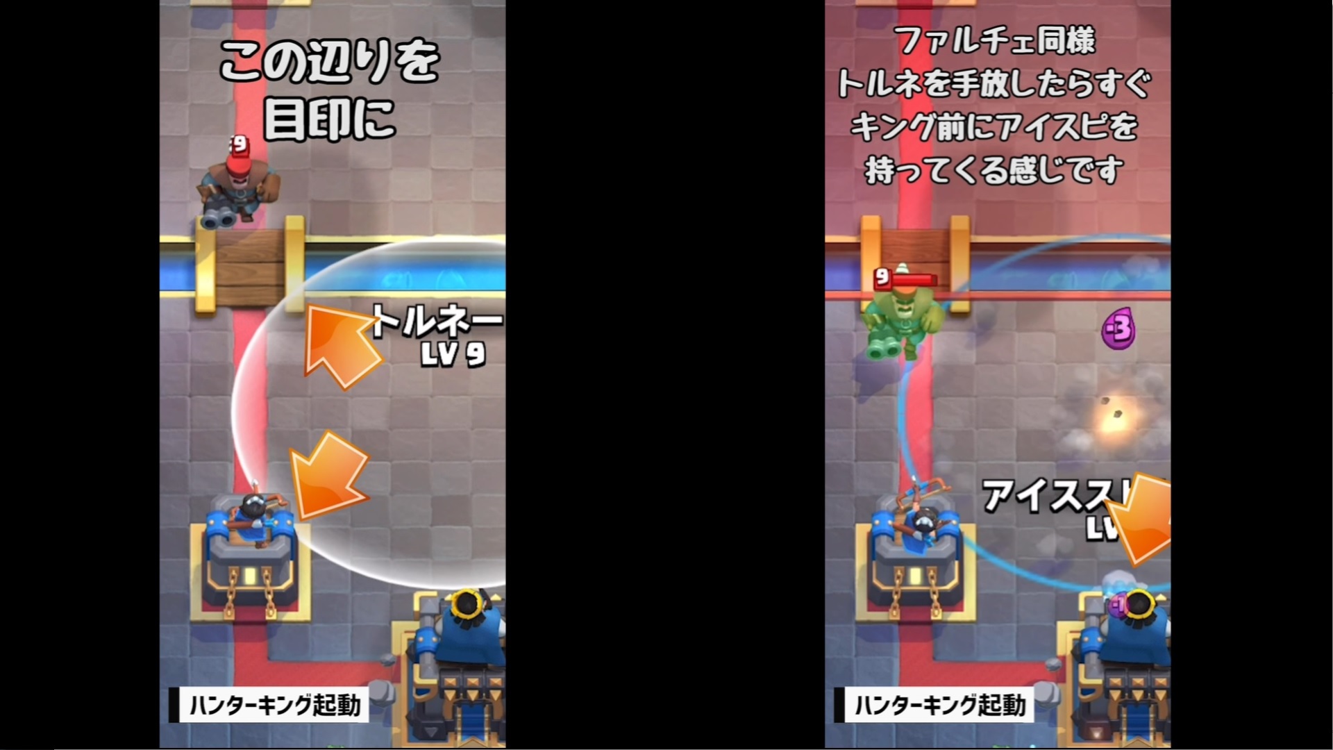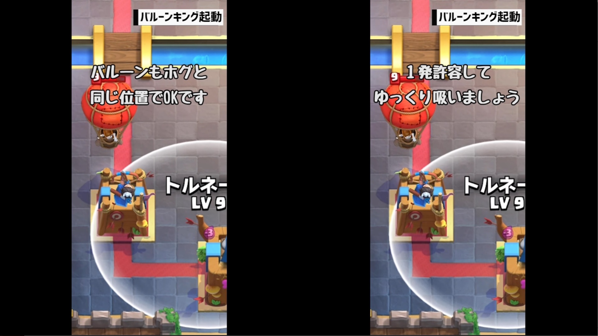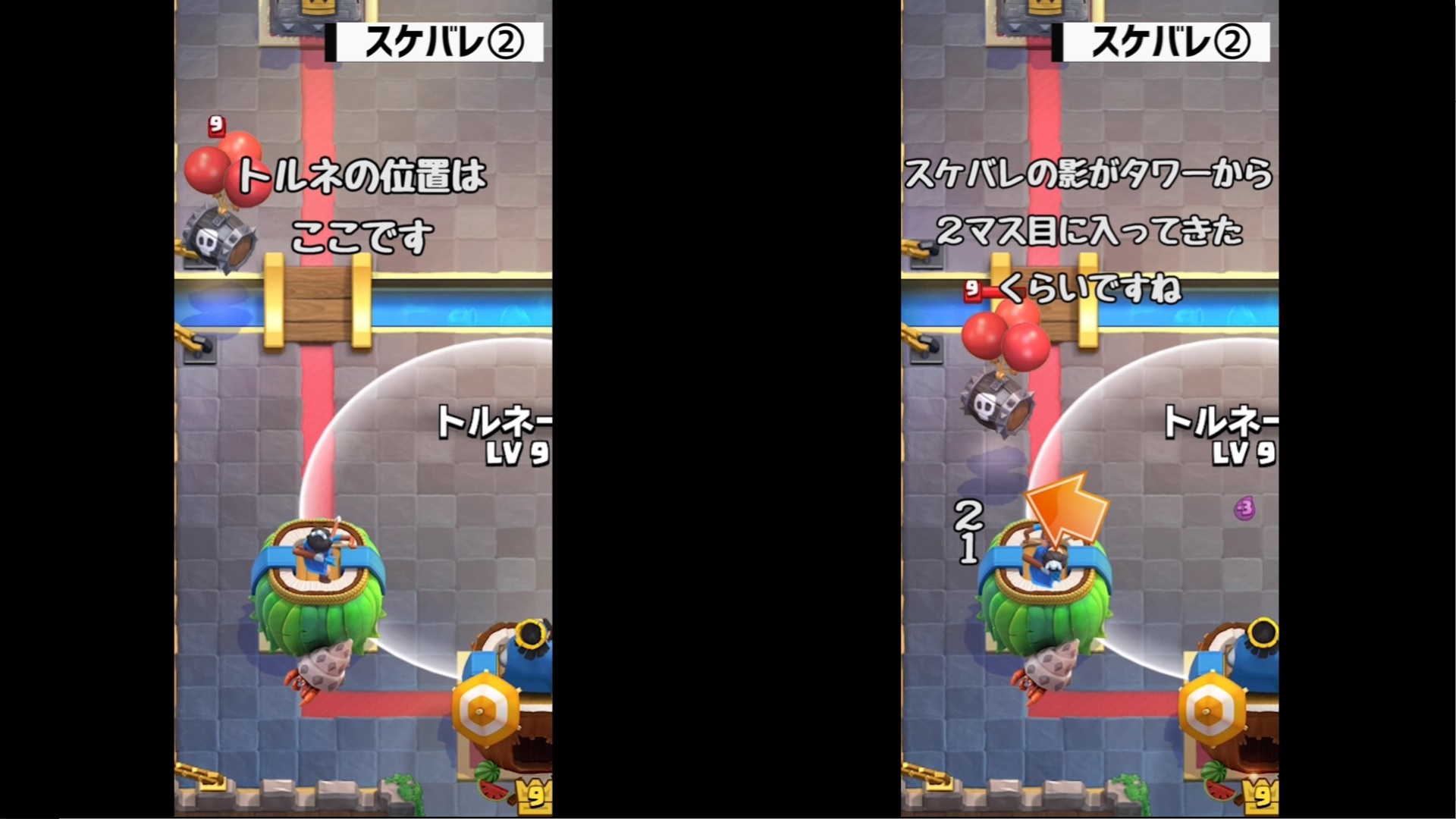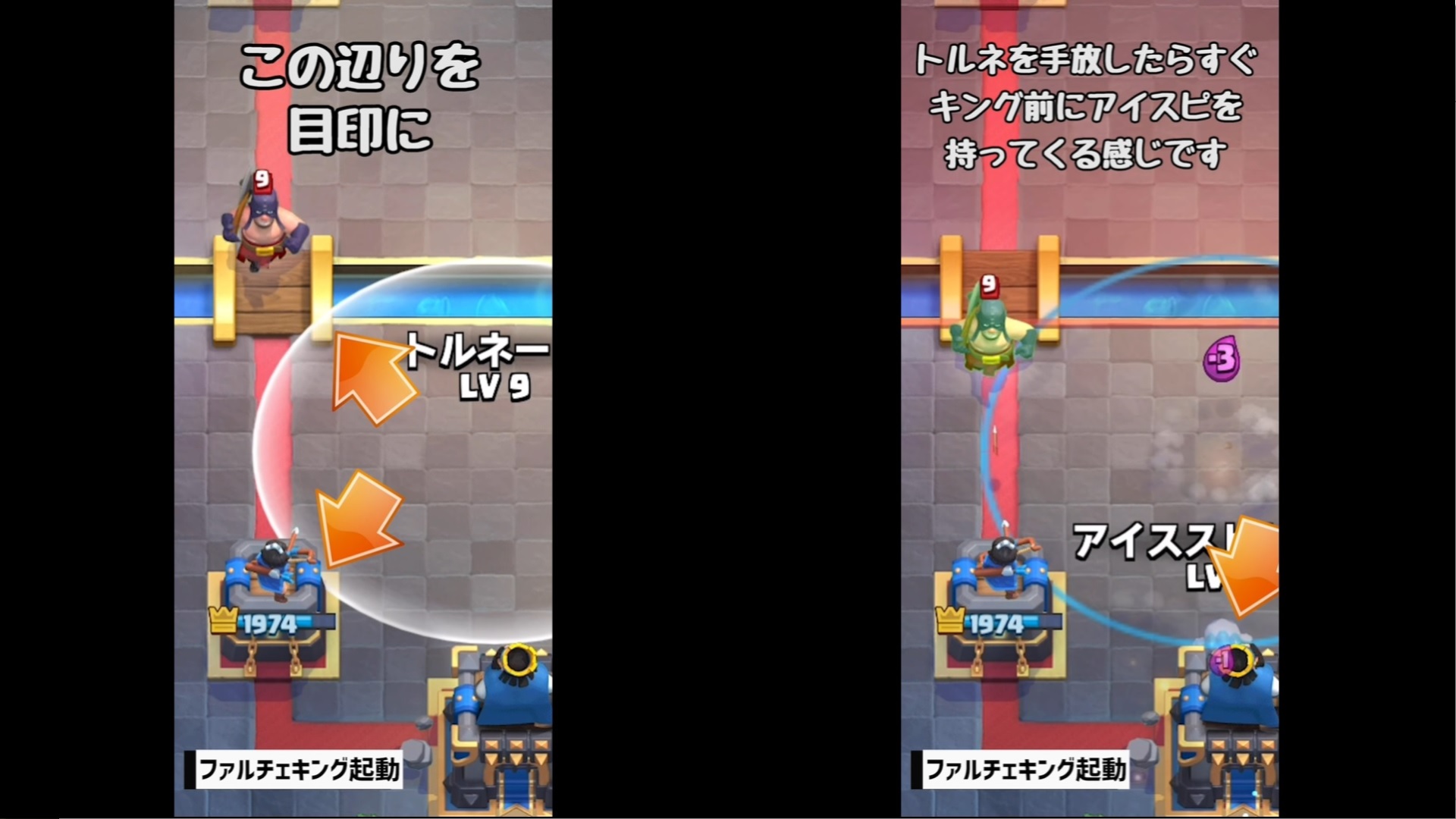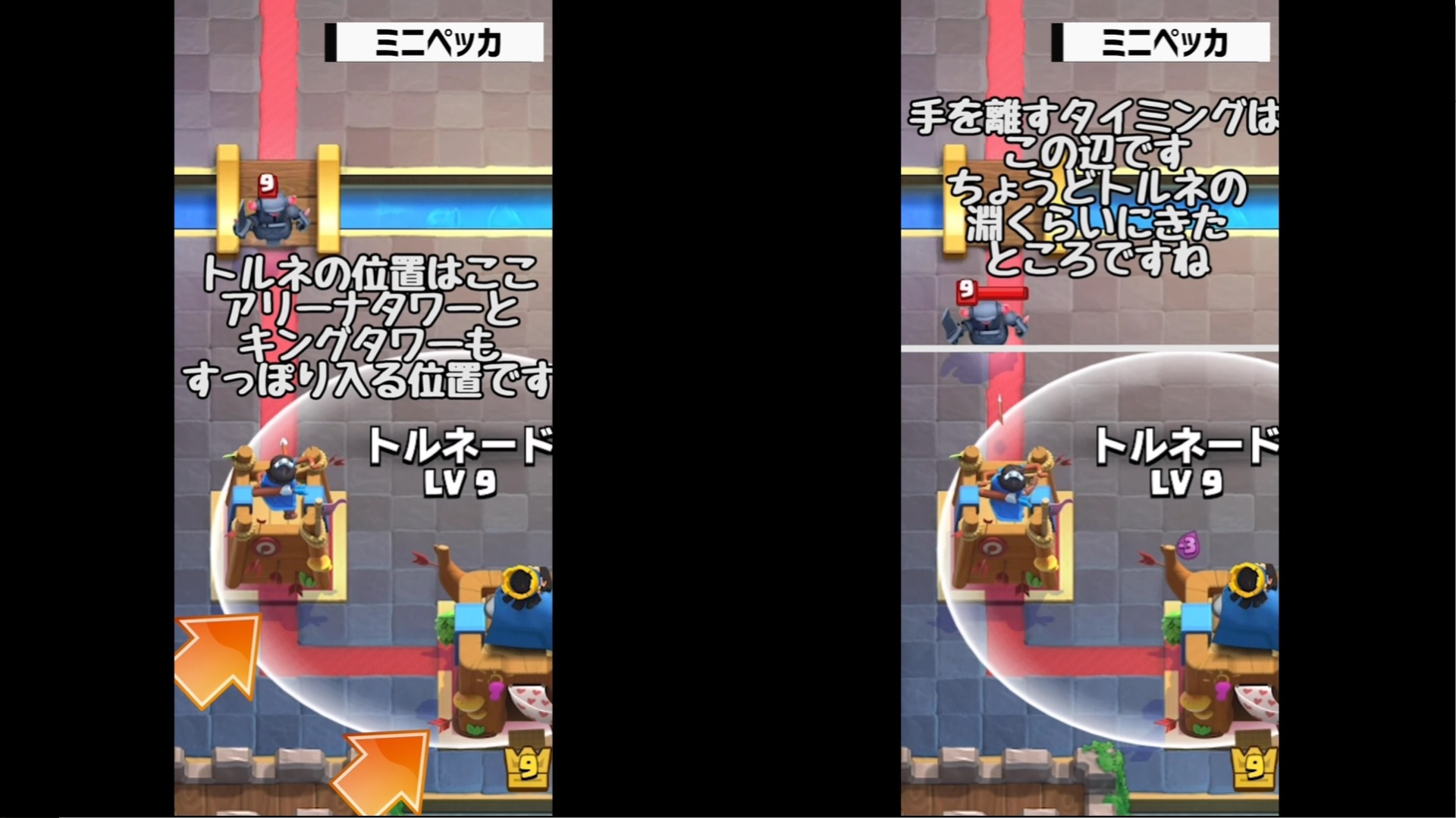それでは、クラロワ大学さんの動画「【クラロワ】トルネード小技集!キング起動の基本から応用まで!|Tornado ProTips【ClashRoyale】」を教科書にして、トルネードの位置とタイミングを覚えていきましょう。