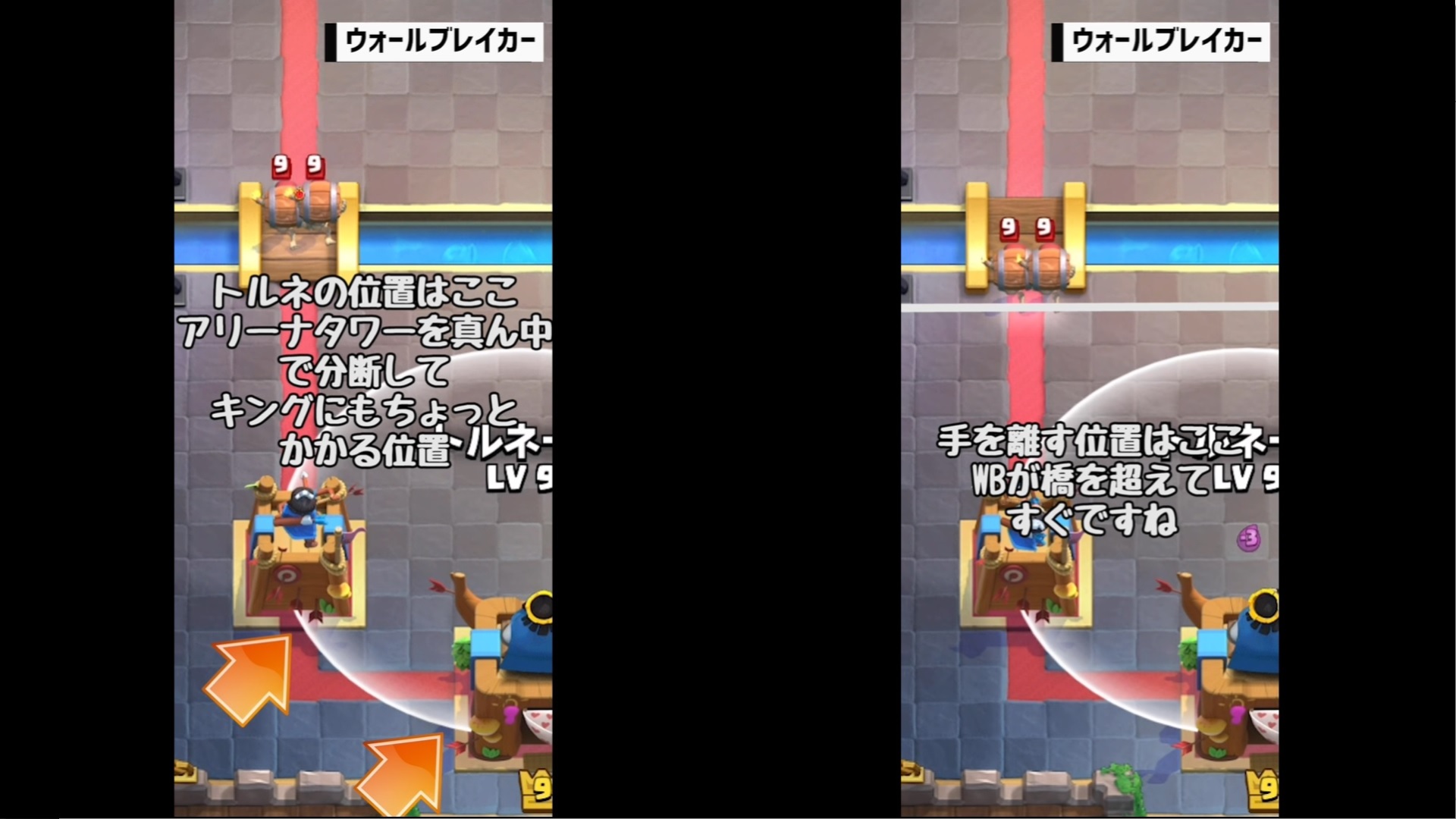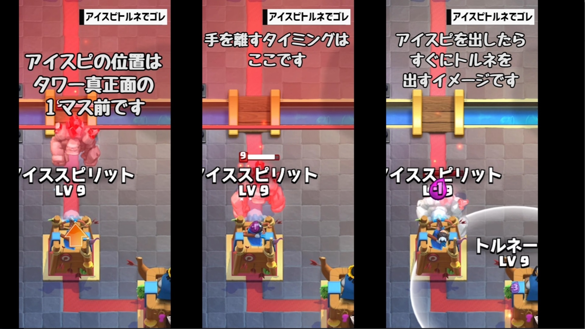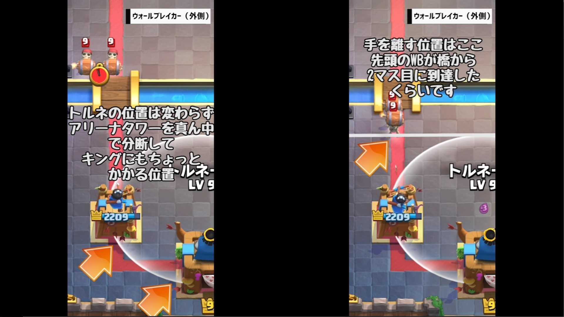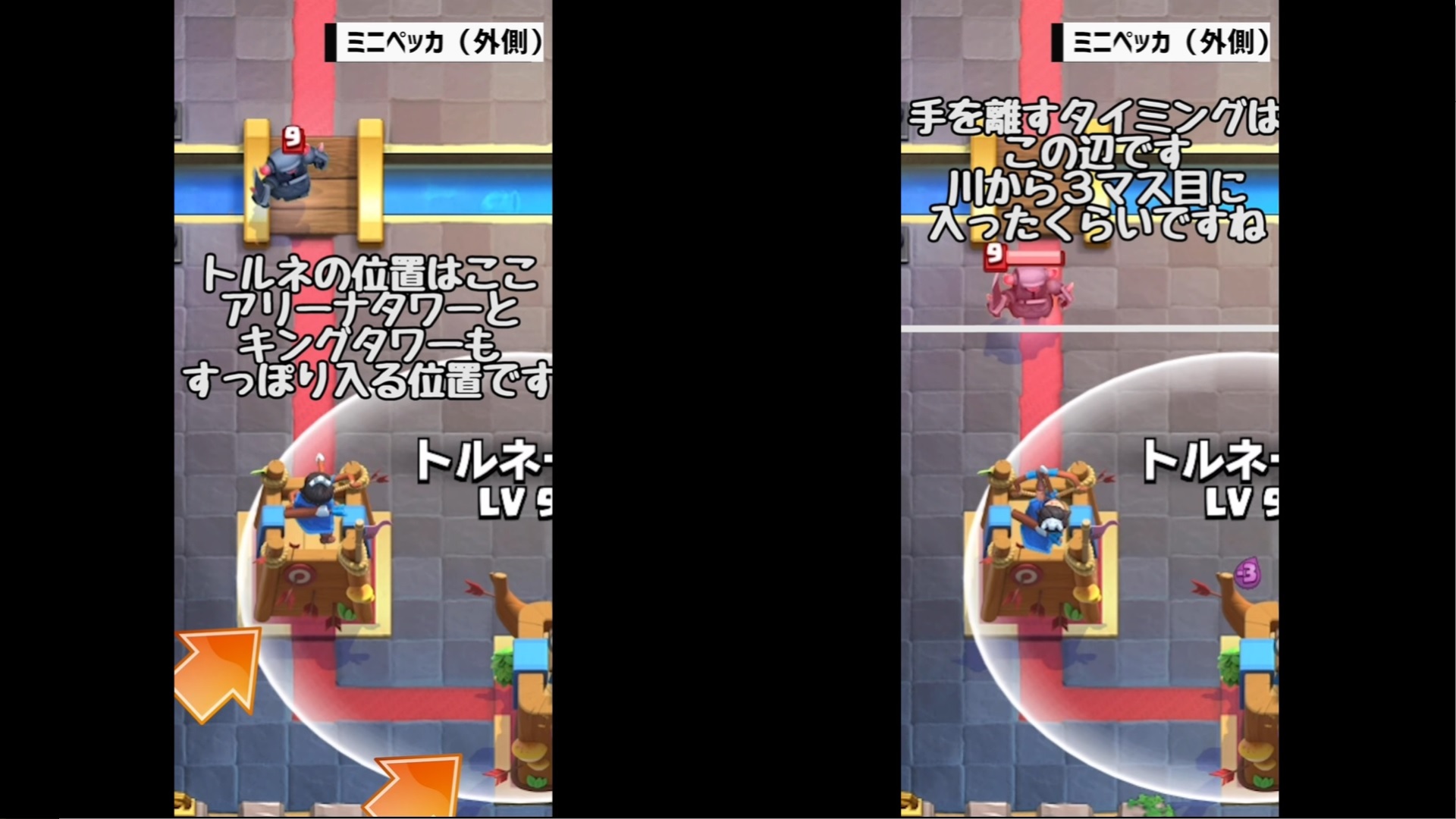 それでは、クラロワ大学さんの動画「【クラロワ】トルネード小技集!キング起動の基本から応用まで!|Tornado ProTips【ClashRoyale】」を教科書にして、トルネードの位置とタイミングを覚えていきましょう。