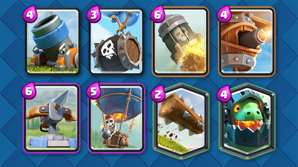 アリーナ6の「大工の作業場」で解放されるカードは、巨大クロスボウや迫撃砲といった特徴的な施設に加え、エアバルーンやスケルトンバレルといった空のウェポンカードを含む8枚です。