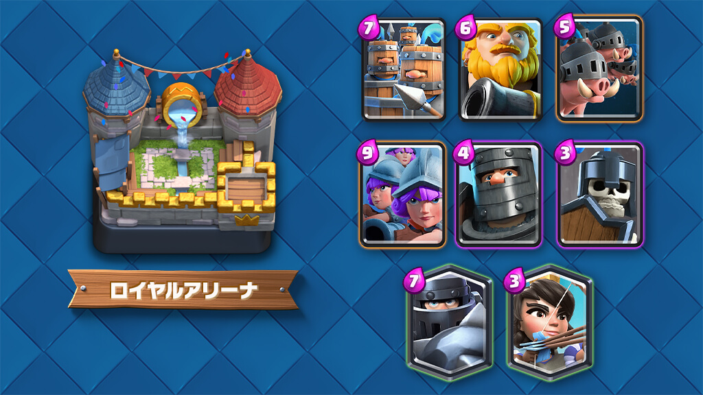 アリーナ7の「ロイヤルアリーナ」では、見習い親衛隊やロイヤルホグ、三銃士などの複数体ユニットを含む8枚のカードが解放されます。