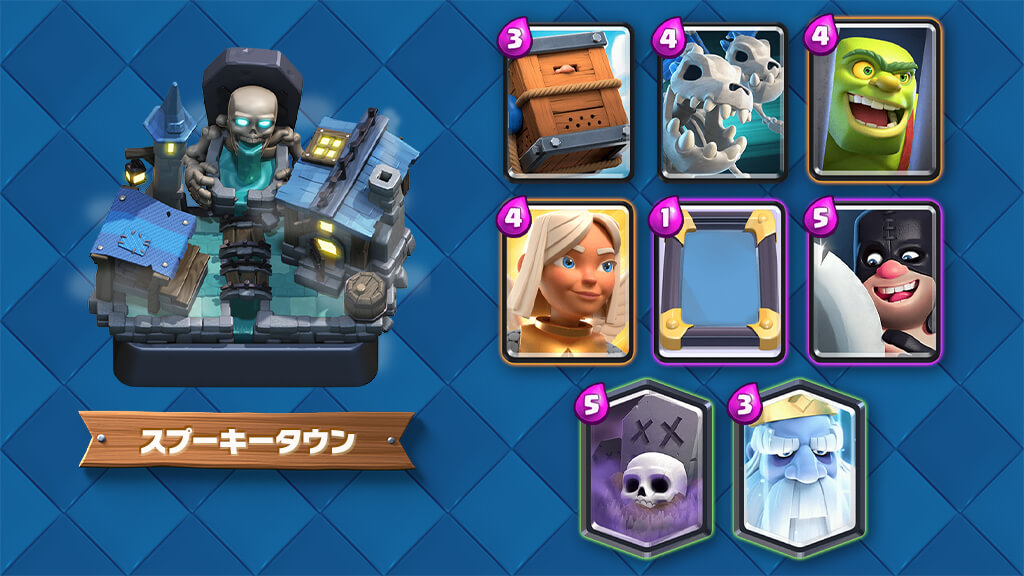 アリーナ12の「スプーキータウン」で解放されるカードは8枚。これでクラロワの101種のカード全てがアンロックされます。