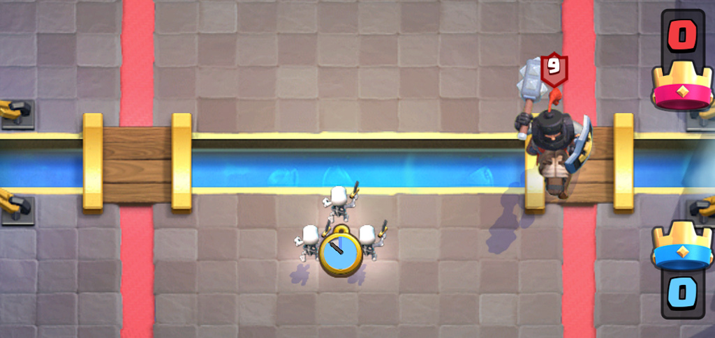 ダークプリンスが橋を渡るタイミングで、スケルトンを自陣中央の川付近に出します。