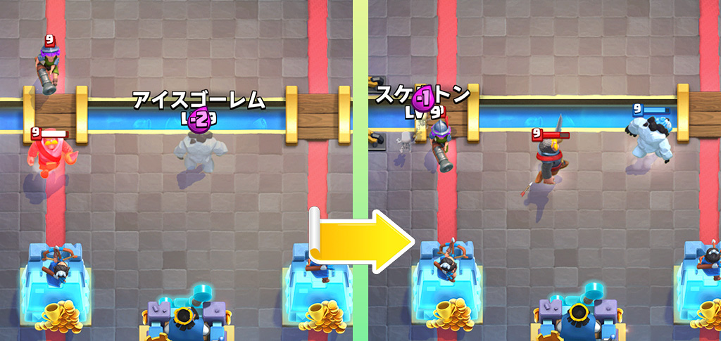 敵ユニットの攻撃をスケルトンで一回受けることで、自陣タワーへの攻撃までに時間を稼ぐ事ができます。