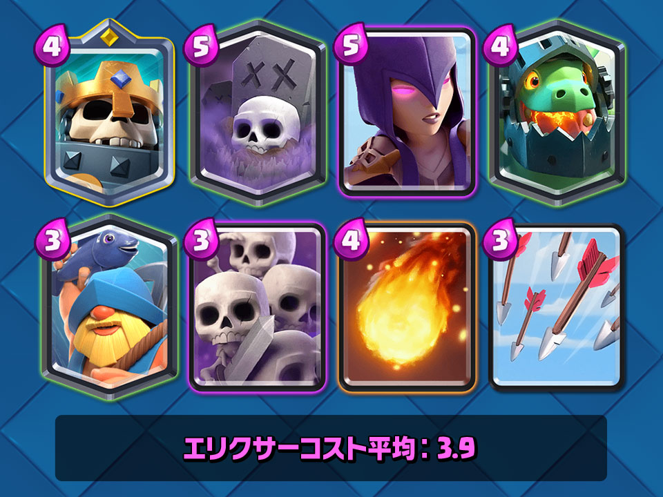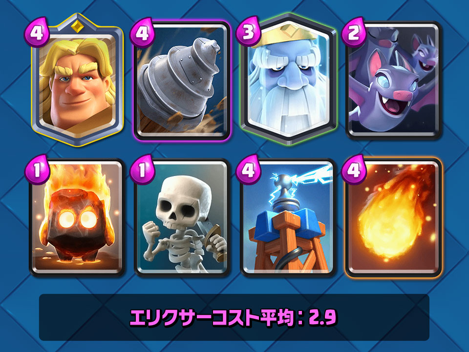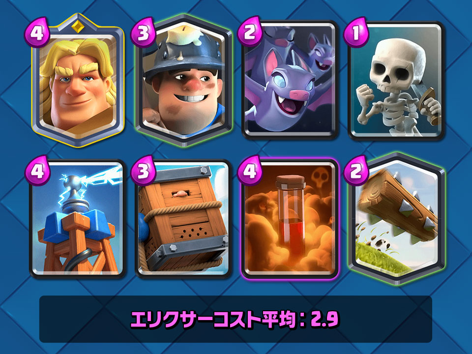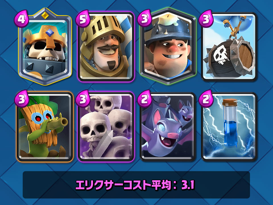 手札を素早く回してスケルトンやコウモリの低コストカードで防衛することで、常にエリクサーアドバンテージを取りながら立ち回りましょう。