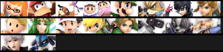 インクリング / ディディーコング / ダックハント / アイスクライマー / ルイージ / フォックス / ジョーカー / リンク / リュカ / パルテナ / ポケモントレーナー / トゥーンリンク / こどもリンク / ロボット / ウルフ / シーク / ルフレ / ルカリオ