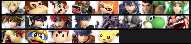 クラウド / ドンキーコング / ドクターマリオ / ガノンドロフ / インクリング / ルキナ / リトルマック / パルテナ / ピット / ブラックピット / ロイ / クロム / リドリー / ウルフ / ヨッシー / ワリオ / クッパ / デデデ / ネス / アイク / ピチュー