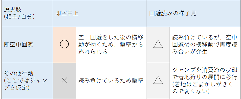 判定が強い技は、相手の技と相打ちになったとき、多くの場合相手の技を打ち消して一方的に攻撃できるということになる。