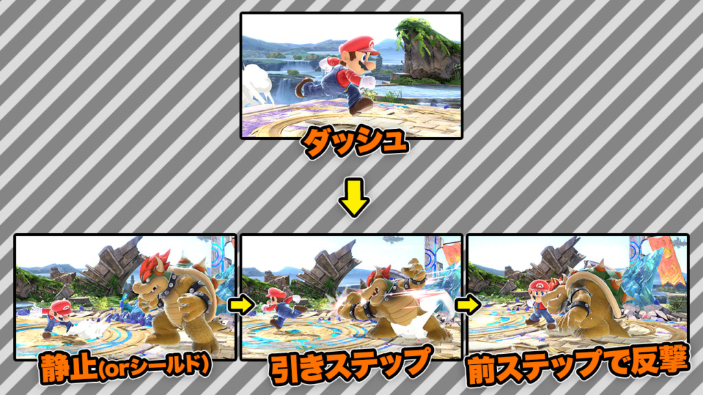 こちらのダッシュに合わせてシールド様子見を挟んでくるor攻撃置きで対処してくる相手に有効で、こちらが攻撃しに行くプレッシャーを与えつつ相手の置き技を誘えます。